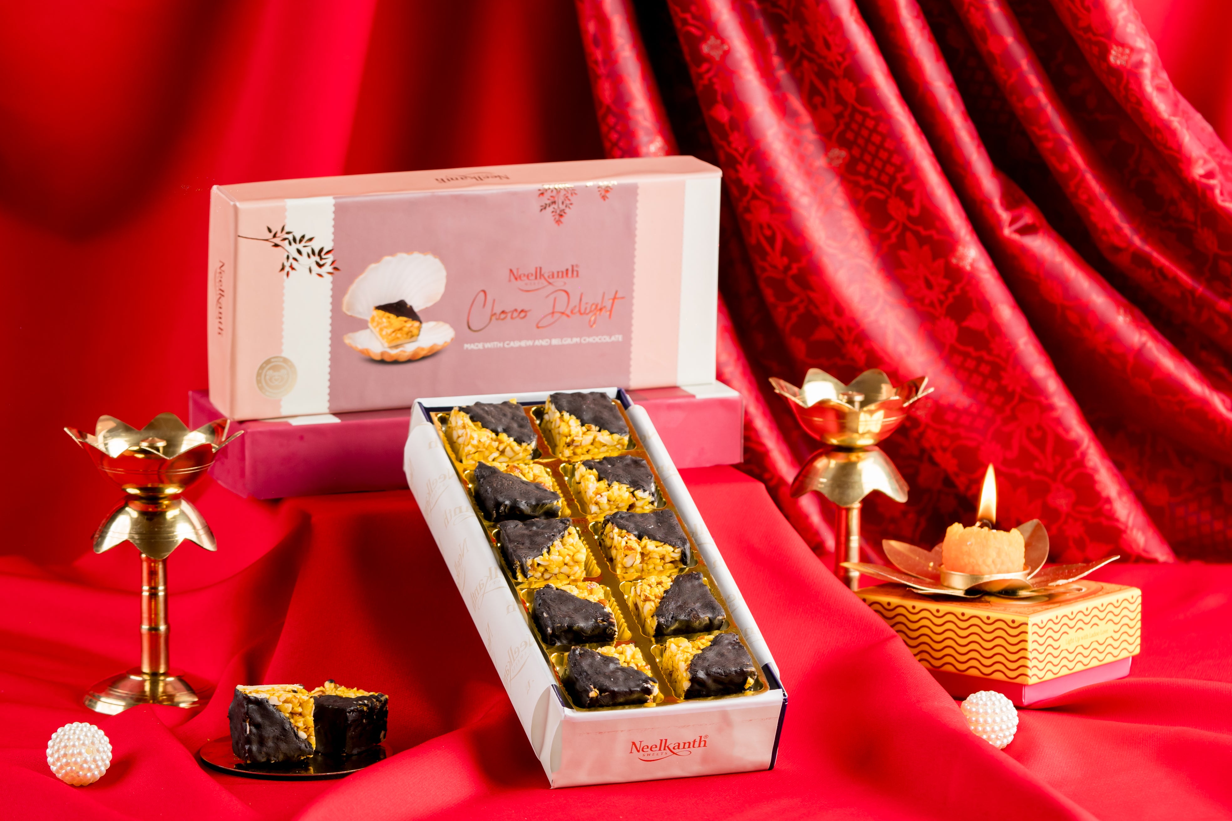 Choco Delight – A decadent fusion sweet made with rich cashews, infused with saffron, and generously dipped in premium chocolate. A perfect blend of tradition and indulgence in every bite.