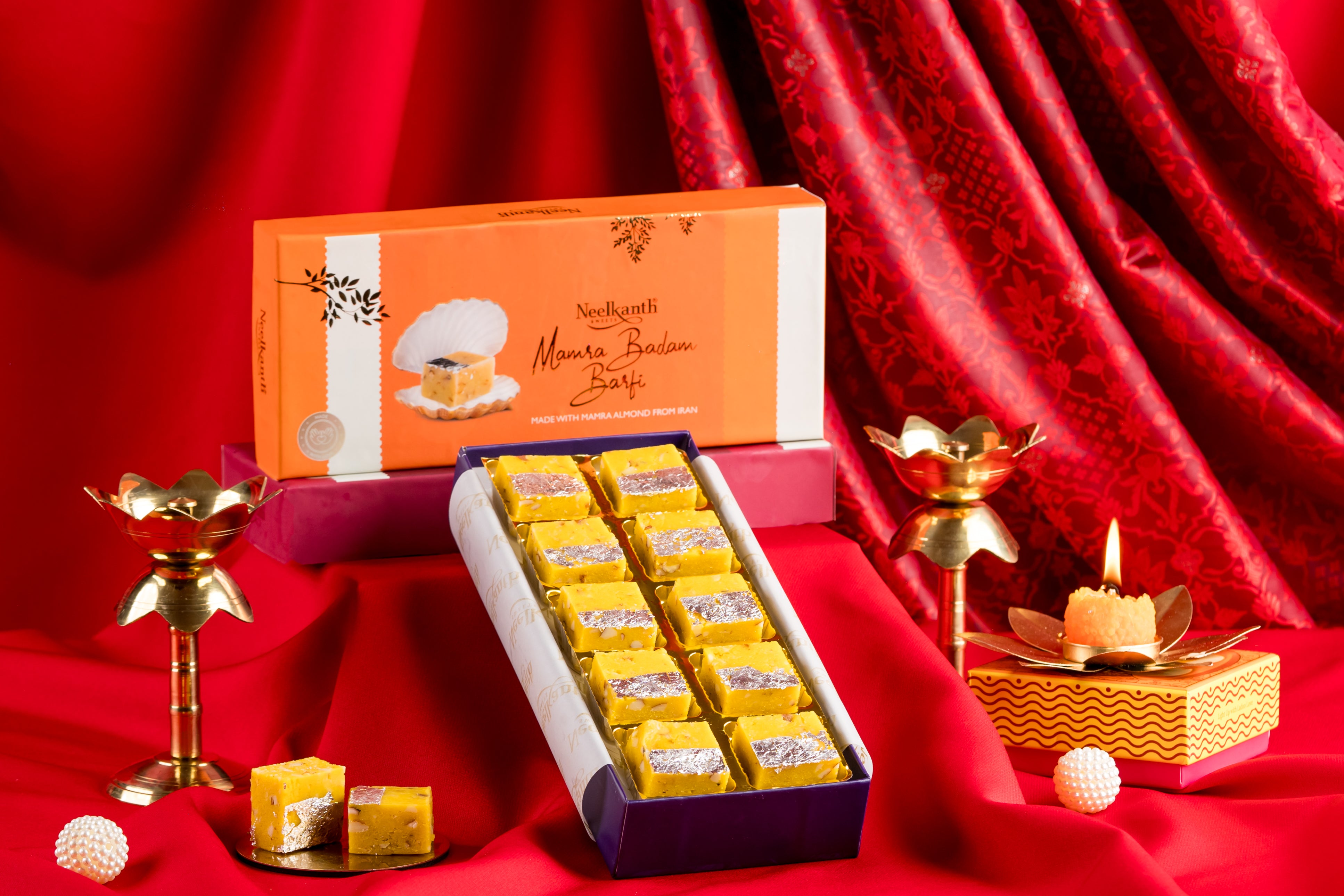 Neelkanth's Mamra Badam Barfi – Crafted from premium Mamra almonds, slow-roasted and blended with Saffron, nutty flavor. A luxurious sweet with high nutritional value, perfect for gifting or festive indulgence.