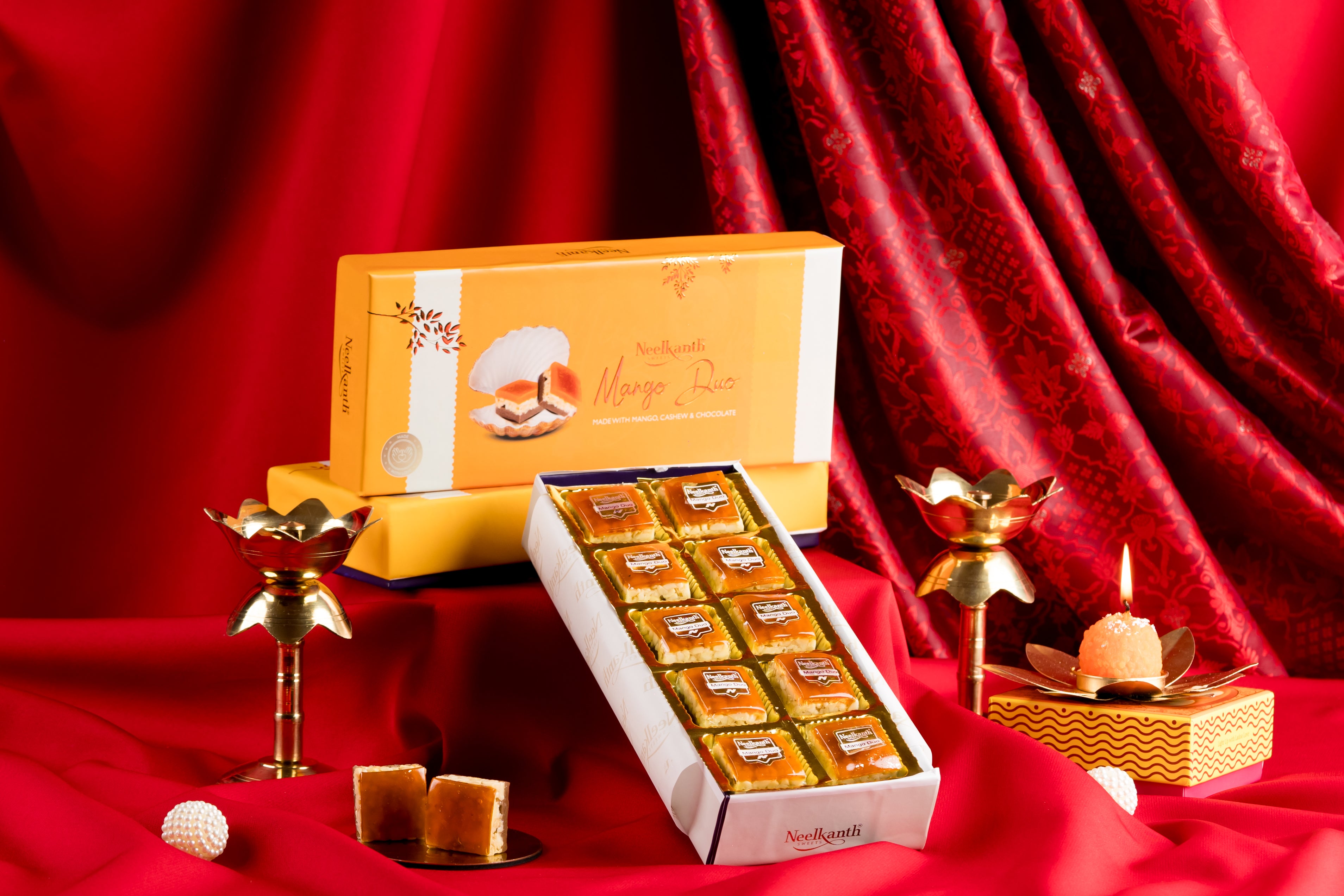 Mango Duo – A delectable triple-layered treat featuring natural mango, rich cashew nuts, and a luscious chocolate-flavored Kaju Katli layer.