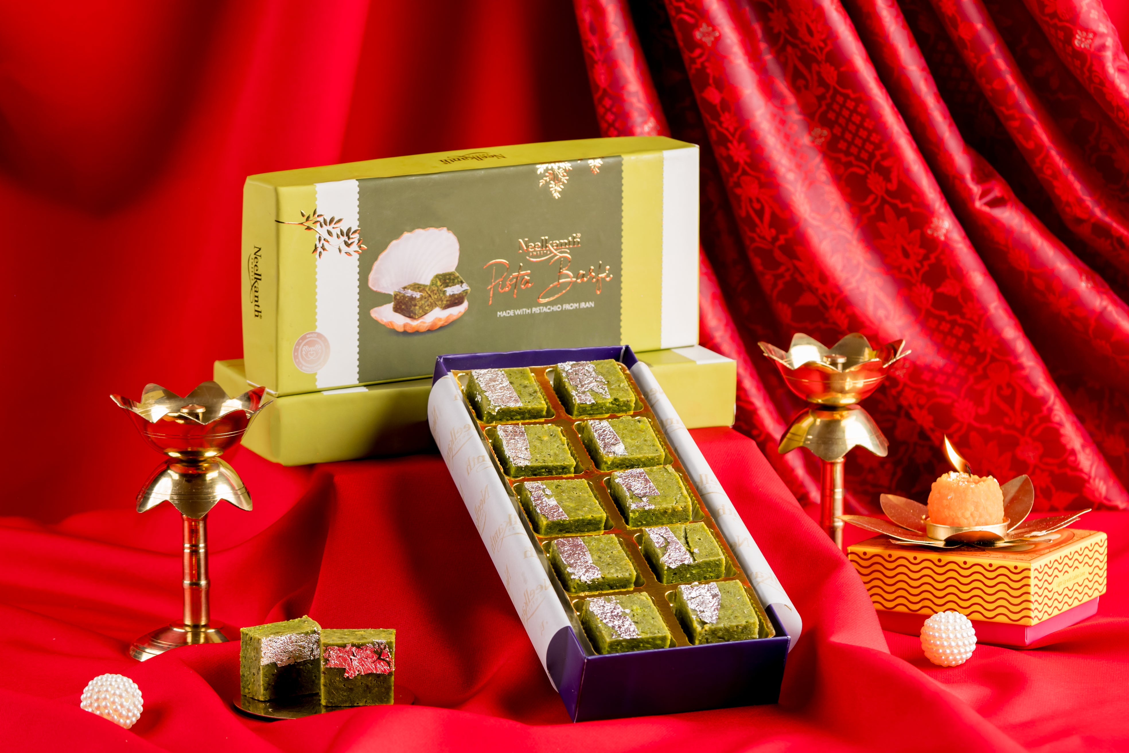 Pista Barfi – A rich and nutty indulgence made from premium pistachios, slow-cooked pure Pistachio from Iran, and a hint of cardamom. Smooth, melt-in-the-mouth texture with a luxurious finish – perfect for festive gifting or a royal treat.